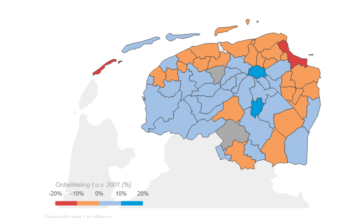 Ontwikkeling inwoners 2001 - 2016 per gemeente (CBS, 2016)